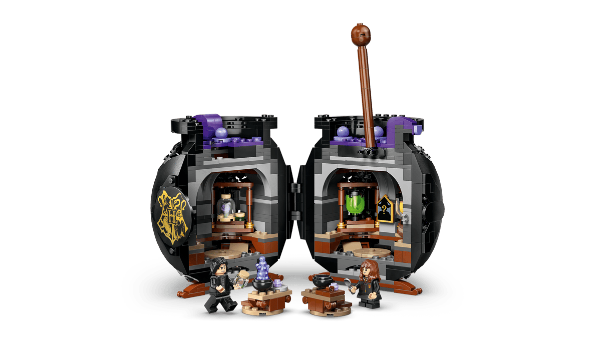 - SECRET CLASSROOM – Move the stirring stick and reveal the classroom with removable tables for easy play, a blackboard, potion bottles and LEGO® ingredients for Wolfsbane, Polyjuice and Love Potions