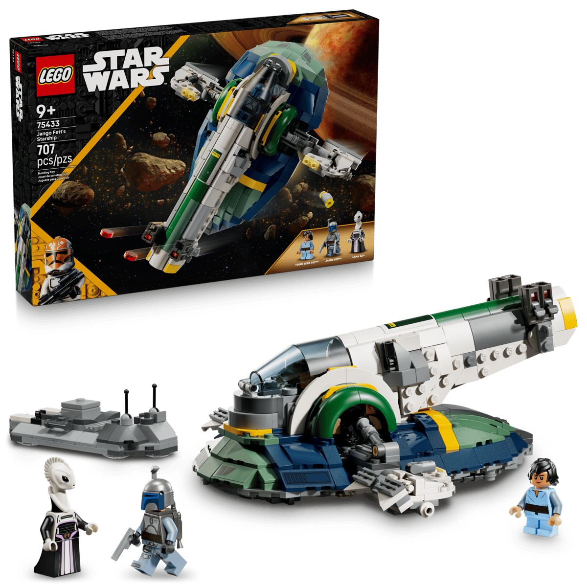 - 3 LEGO® Star Wars™ minifigures – Jango Fett with 2 blaster pistols and a jetpack, Young Boba Fett and Lama Su