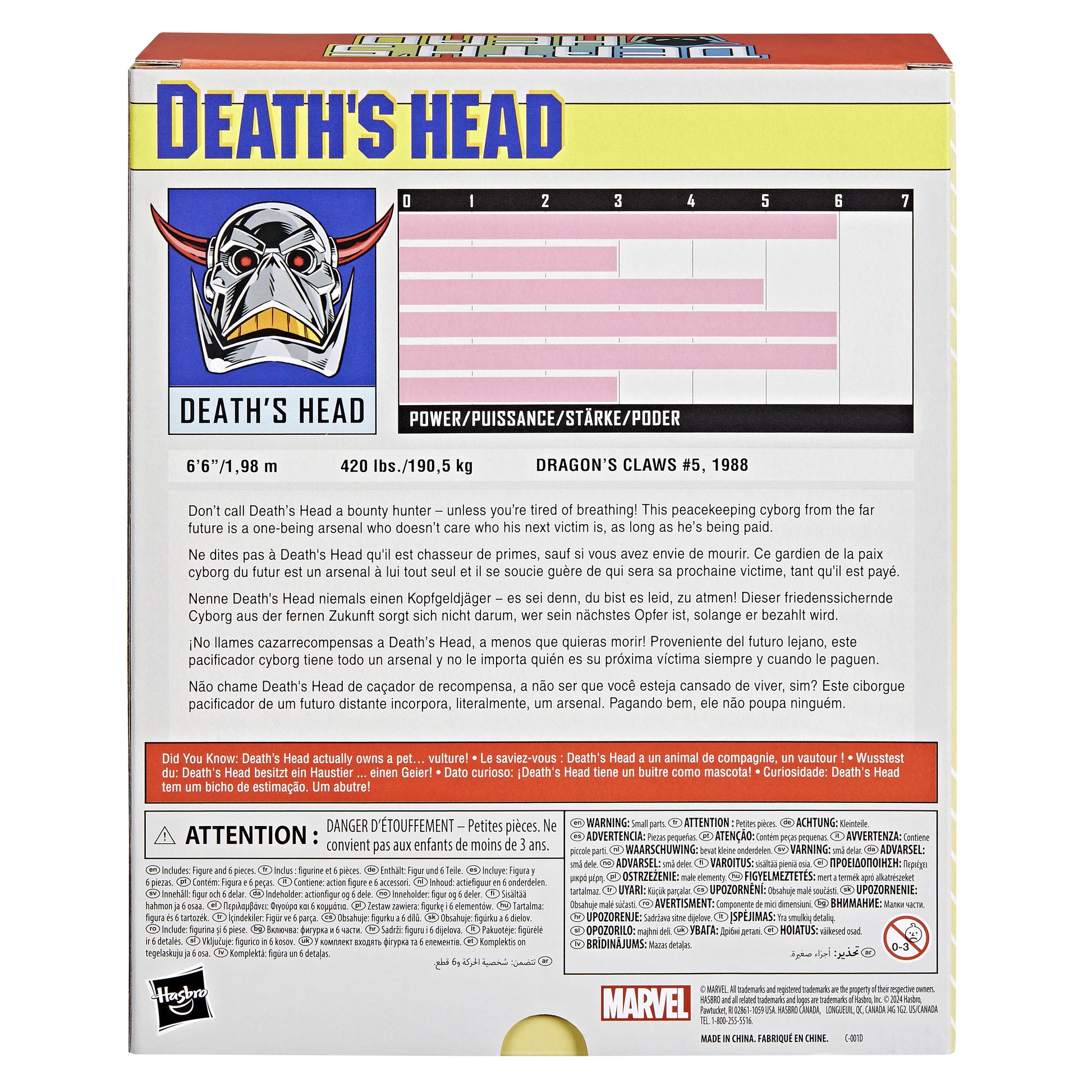From Hasbro Toy Group. Bring the excitement and wonder of the Marvel Universe to your collection with Hasbro Marvel Legends Death's Head figure! This collectible figure is detailed to look like the character from Marvel comic books. 6-inch scale Marvel figures are fully articulated with poseable head, arms, and legs. Marvel action figure set comes with 6 accessories, including weapon accessories that can be displayed on his back. Collectible action figure stands at 7.65 inches tall and comes in an exclusive window box package inspired by character's retro collector card. Hasbro Marvel action figures' 6 inch scale make them great for posing and displaying in fans' collections. Reimagine Marvel comics-inspired scenes on your shelf with Marvel Legends action figures.