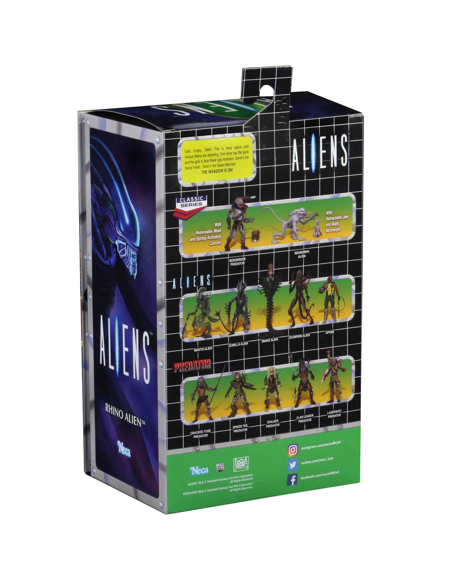 Rhino Alien measures approximately 10" and has a massive ramming horn for attacking its unlucky prey. The packaging is an homage to the classic Kenner art, featuring custom illustrations.